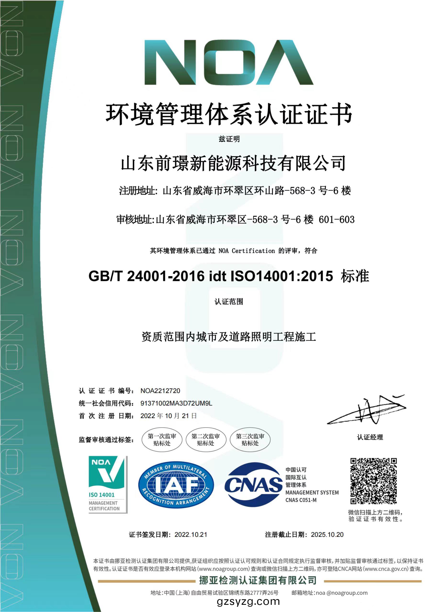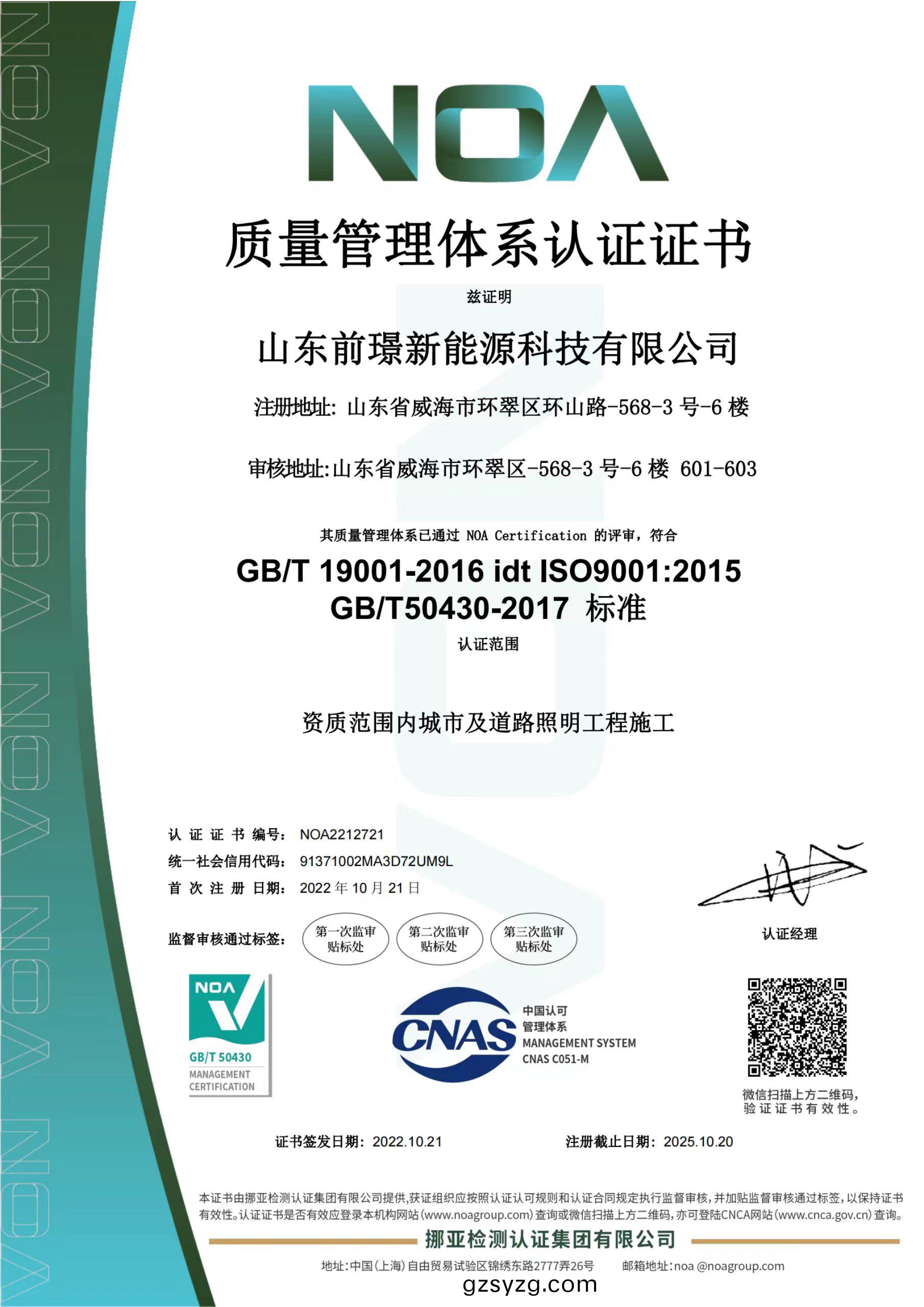 质(zhi)量(liang)是(shi)企业的(de)生(sheng)命(ming)线(xian),是企业的(de)命(ming)脉和灵(ling)魂,为进一(yi)步规(gui)范(fan)公司业务流程(cheng)、有(you)效控(kong)制风险(xian),形(xing)成(cheng)标(biao)准化(hua)经营(ying)、规(gui)范(fan)化(hua)管理(li)的模式(shi),山东前(qian)璟新(xin)能源科技有限公(gong)司(si)于(yu)2022年(nian)起开始推行(xing)ISO45001、ISO9001、ISO14001三大(da)体系(xi)认证工作(zuo),并(bing)在(zai)同(tong)年10月(yue)份(fen)首次通(tong)过(guo)ISO45001、ISO9001、ISO14001三(san)大体系认(ren)证(zheng)。2022年中旬(xun)公(gong)司(si)成(cheng)立专(zhuan)门(men)小组(zu),全面(mian)负责(ze)贯(guan)标工作并将其作为(wei)2022年(nian)重点(dian)工作之一。
